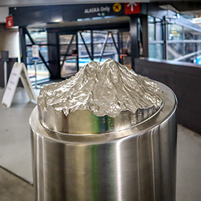 As you cross Skybridge 1 at the south end of parking garage, you’ve likely seen the lipstick toppers for the bollards. In early 2025, Skybridge 6 also got a bollard upgrade. Nothing says welcome to the Pacific Northwest better than mountains and hiking trails. The stainless steel bollards feature mini-Mt. Rainier replicas that sit atop and a path of the Wonderland Trail on the others. Take a sensory journey by following the crevices to the peak, or adventure beyond with the etched-in, winding route that encircles Mt. Rainier. These bollards were designed and made possible by artists, Kyle Olson and Sandra Williams.